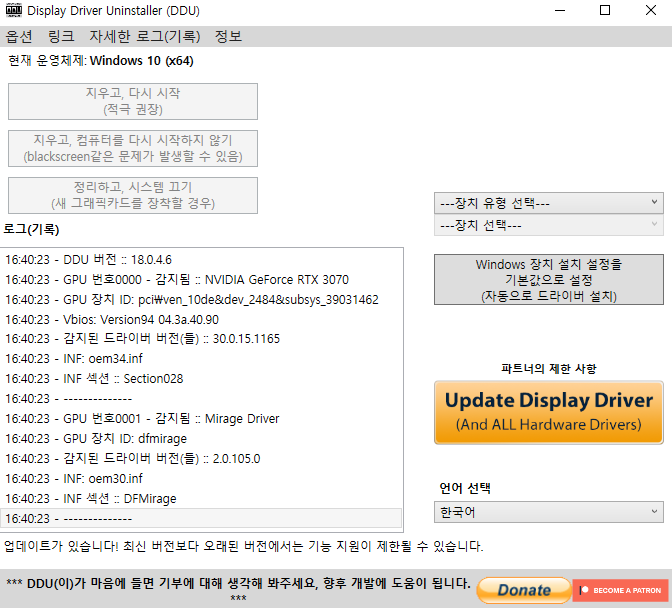 1. Display Driver Uninstaller (DDU) 를 이용한 디스플레이 드라이버 삭제 후 재설치